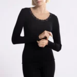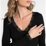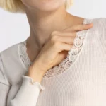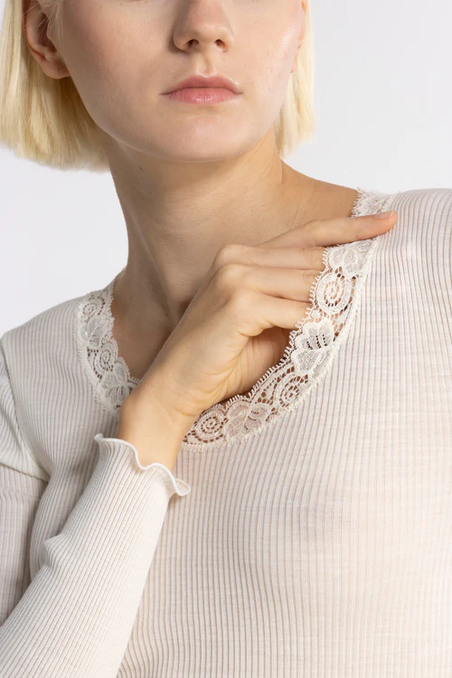 Top à manches longues,courtes ou débardeurs fabriqué à partir d'un mélange intime précieux et naturel de laine mérinos extra fine et de soie pure de haute qualité avec la plus élégante et féminine dentelle française Leavers, certifiée et numérotée comme véritable “Dentelle de Calais®”.