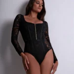 Entièrement en dentelle florale confortable, douce et élégante, ce body à manches longues offre un joli décolleté carré souligné par un zip doré très sexy.